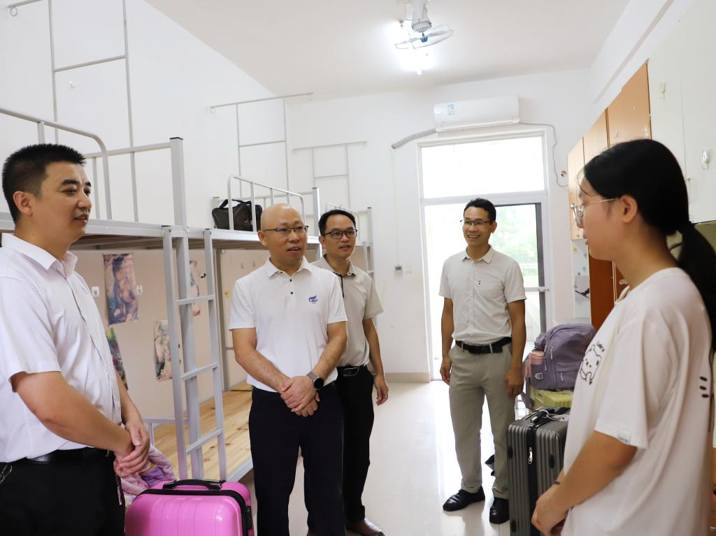 英国上市公司365党委书记李雨(左二)、副校长李培良(左三)深入宿舍与新生亲切交谈