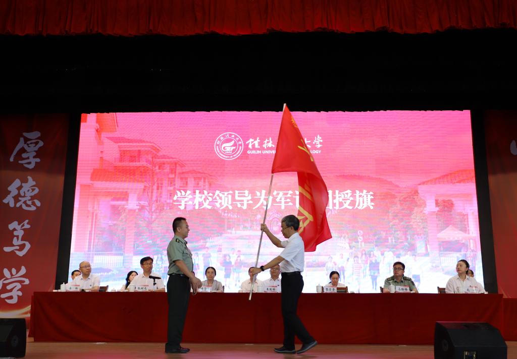 典礼最后,学校党委常委、副校长黎贞崇为军训团授旗,军训团团长甘锦琛代表军训团接受授旗。