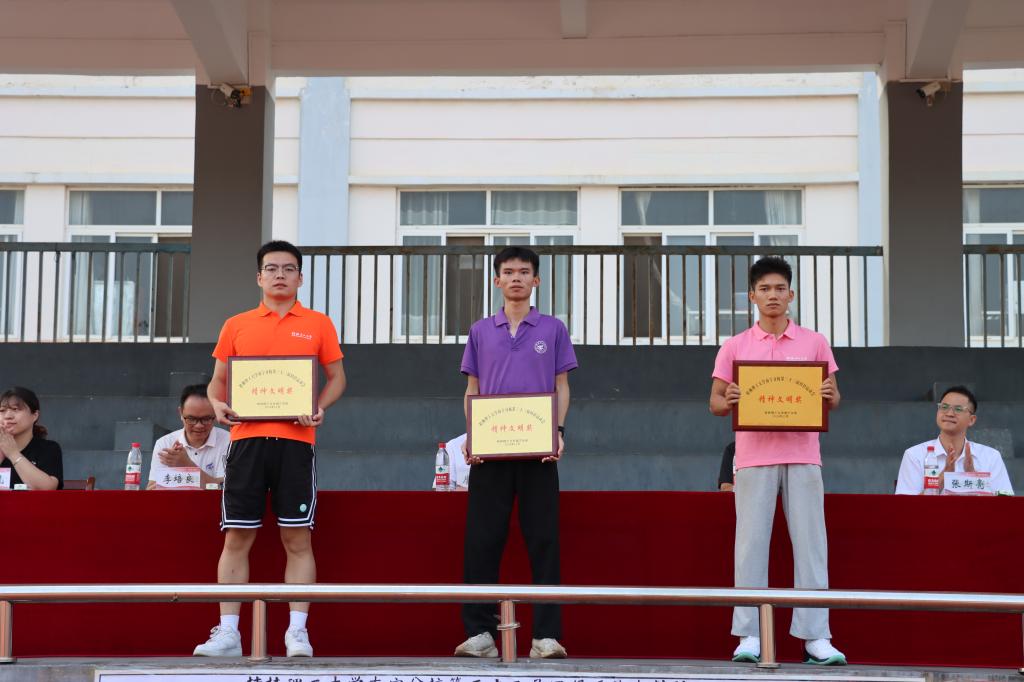 闭幕式上,本届运动会总裁判长黄远旺宣布比赛成绩。计算机应用学院荣获团体总分第一名;计算机应用学院、电气与电子工程学院、土木与测绘工程学院荣获女子团体总分前三名;土木与测绘工程学院、计算机应用学院、冶金与资源工程学院荣获男子团体总分前三名。冶金与资源工程学院、计算机应用学院、电气与电子工程学院获“优秀组织奖”;土木与测绘工程学院、经济与管理学院、机械与控制工程学院获“精神文明奖”。主席台就座领导为获奖单位和个人颁奖。