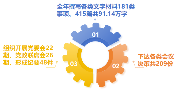 切实增强文稿撰写的针对性、专业性、准确性,为顶层设计和决策提供有力支持。撰写各类文字材料181类事项、415篇共91.14万字,参谋助手作用进一步增强。切实提高机要信息上传下达、信息流传的效能,严把文字质量关、严守公文程序关,印发文件138件,收文1026件,上报公文请示12件,盖印1195次。组织开展党委会22期、党政联席会26期,形成纪要48件,下达各类会议决策209份,进一步提升工作推动实效。