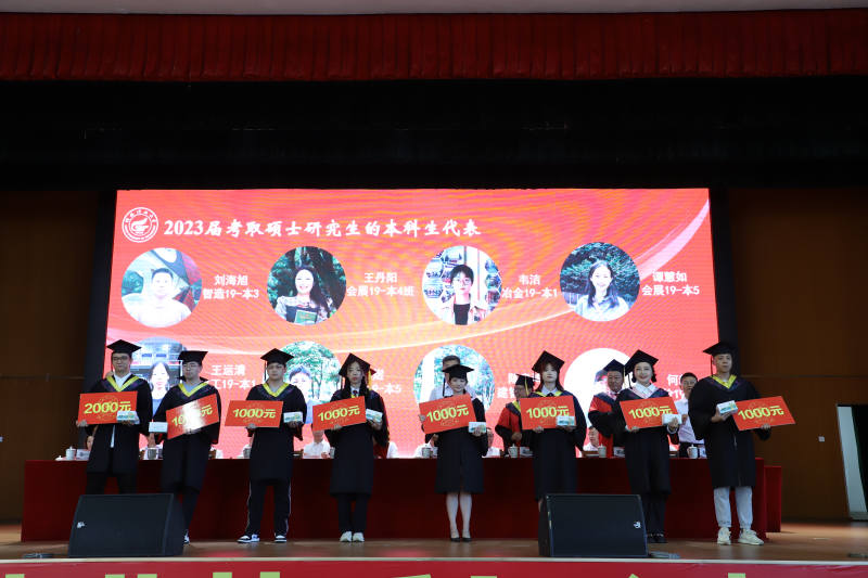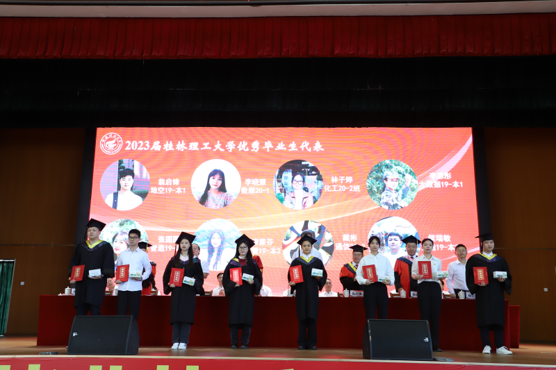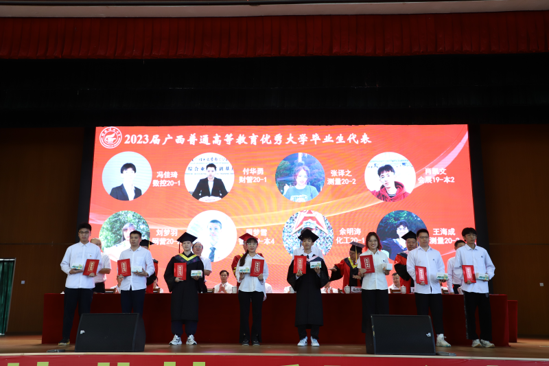 在主席台第一排就座的领导为区级优秀大学毕业生代表、校级优秀大学毕业生、考取硕士研究生代表、西部计划志愿者代表、崇左市“留人计划”学生代表、校友联络员代表颁奖,并赠送毕业生纪念品。