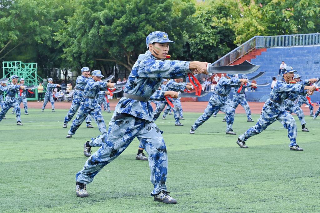 分列式上,34个方队依次通过主席台接受检阅,以铿锵的步伐和嘹亮的口号致敬从抗战胜利到新时代的八十年峥嵘岁月,表达对祖国的深情礼赞。在军事科目展演中,队列会操整齐划一,转身靠脚干净利落,彰显了同学们令行禁止的纪律观念;匕首操与刀术表演动作有力、气势十足,展现出桂工学子的昂扬锐气;应急棍方队招式流畅、配合默契,体现了团结协作的精神;刺杀操与战术表演更是将现场气氛推向高潮,同学们动作勇猛、口号洪亮,以饱满的热情致敬历史,面对模拟的突发场景,立刻进入状态、高效应对,展现了新时代大学生传承红色基因、担当时代重任的坚定决心。