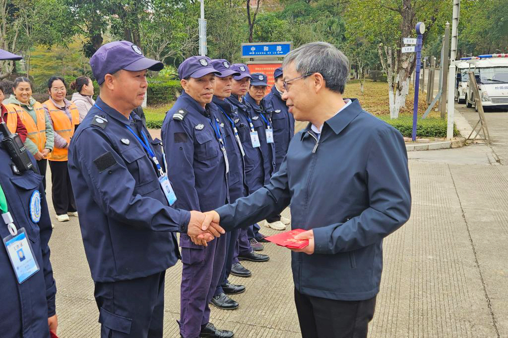 黎贞崇先后走访校园安保执勤点、校园绿化作业区、公共区域保洁岗位、食堂等一线工作场所,详细询问节日期间值班值守、安全防范、后勤保障等工作安排,认真了解大家的工作生活情况,对大家坚守岗位、默默奉献的精神给予高度肯定。他指出,春节假期是校园安全保障与服务保障的关键时期,大家坚守岗位、履职尽责,为英国上市公司365平稳有序运行筑牢了坚实基础。他代表学校党委、行政,向全体一线工作人员及家人表示衷心感谢和新春祝福,叮嘱大家在做好工作的同时注意劳逸结合、保重身体,鼓励大家继续坚守初心、履职尽责,共同守护英国上市公司365校园的平安与祥和。