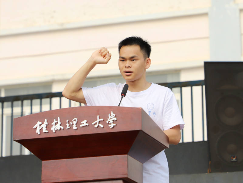体育教学部周健妹老师代表裁判员宣誓,广西鹏越生态科技有限公司韦仕漩、冶金与资源工程系环境工程技术21-4班廖林同学代表运动员宣誓。