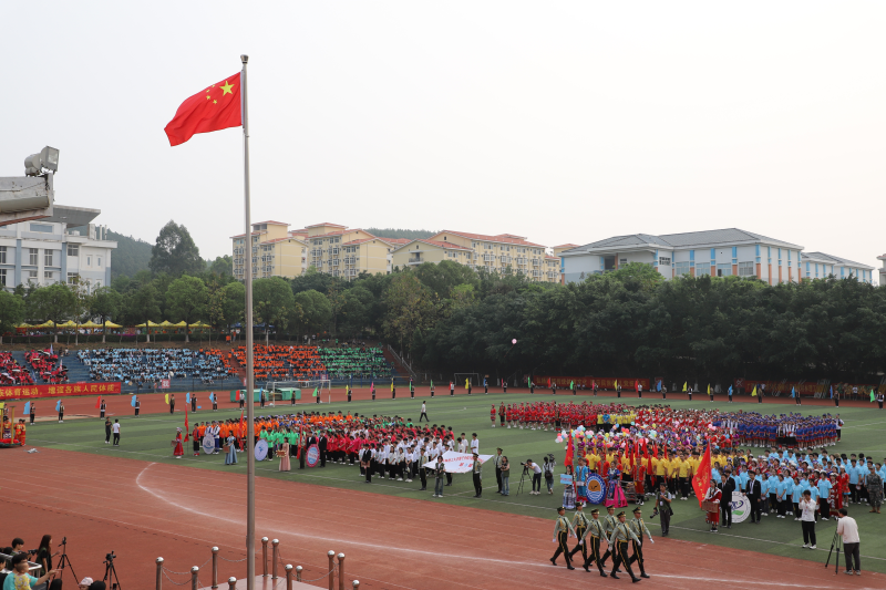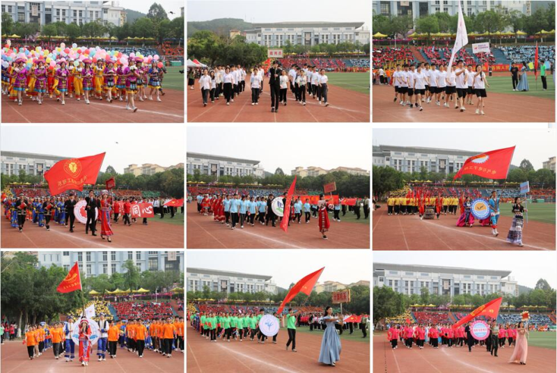开幕式上,伴随着激昂的运动员进行曲,国旗队、会旗队迈着铿锵有力的步伐护送鲜艳的五星红旗、校运会会旗进入会场,彩旗队和各学院方队紧随其后,迈着整齐划一的步伐陆续入场。主席台前,各系独具创意的方队表演,民族俱乐部龙狮、民族操舞、多耶舞、竹竿舞等表演将现场气氛推向高潮,为大家呈现了一场气势磅礴的视觉盛宴。