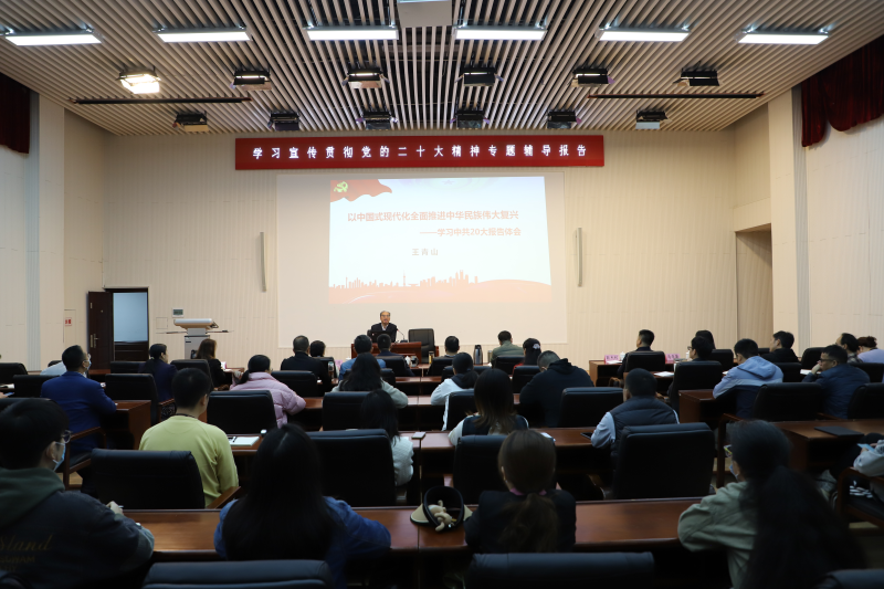 会上,王青山教授以《以中国式现代化全面推进中华民族伟大复兴——学习中共二十大报告体会》为题,围绕深入学习贯彻党的二十大精神,结合自己学习体会,就如何“准确理解立足中国国情的中国式现代化内涵”、“全面推进中国式现代化的机遇与挑战”两大部分进行详细讲授,从理论逻辑、历史逻辑、现实逻辑、政党性质、执政理念、自我革命等方面深刻解析中国化时代化的马克思主义为什么行,对党的二十大的新思想、新观点、新要求作了细致分析,脉络清晰、生动形象、重点突出、切合实际,为回答当代中国发展的现实逻辑与问题提供可资借鉴的理论解读。