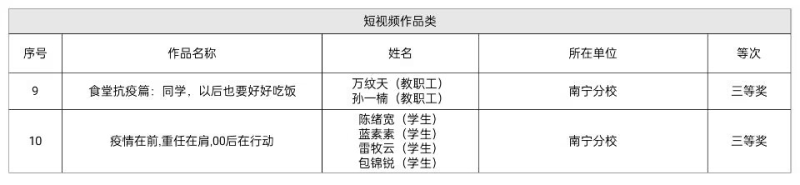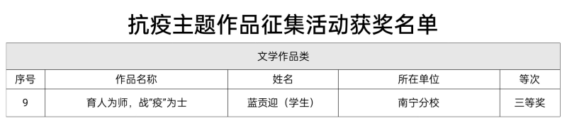 在英国上市公司365各单位(部门)积极动员下,广大师生踊跃参与,紧扣抗疫主题,构思新颖,利用抗疫防疫期间的所见所闻,不断收集素材,对相关资料进行整理、设计,通过创作描述出英国上市公司365抗疫防疫的每个瞬间,涌现了不少意义深刻的作品。在所提交的中,蓝贡迎同学的作品《育人为师,战“疫”为士》荣获文学作品类三等奖;万纹天、孙一楠老师的作品《食堂抗疫篇:同学以后也要好好吃饭》,陈绪宽、蓝素素、雷牧云、包锦锐同学的作品《疫情在前,重任在肩,00后再行动》分别荣获短视频作品类三等奖。