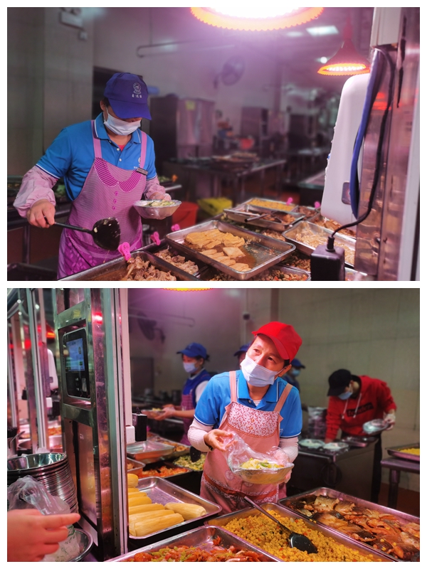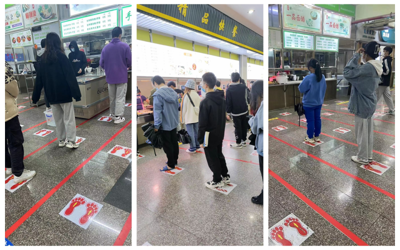 实施三种模式,确保就餐安全卫生。一是实行“早核酸晚自测”监管模式,加强食堂人员管理,全程佩戴口罩和一次性橡胶手套;二是实行“面对面隔离”勿扰模式,餐桌设立就餐隔离挡板,采取错峰就餐的方式;三是实行“一米距离”规范模式,食堂地面贴标识,就餐排队保持一米距离,避免因人员密集产生安全隐患。