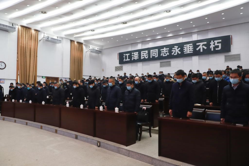 上午10时整,江泽民同志追悼大会正式开始。全场悲痛肃立,在低回的哀乐中默哀三分钟,表达对江泽民同志的崇高敬意和无尽哀思。大会中,大家认真聆听了习近平总书记所致的悼词,追忆江泽民同志伟大光辉的一生。追悼大会结束时,全体人员向江泽民同志遗像深深三鞠躬。