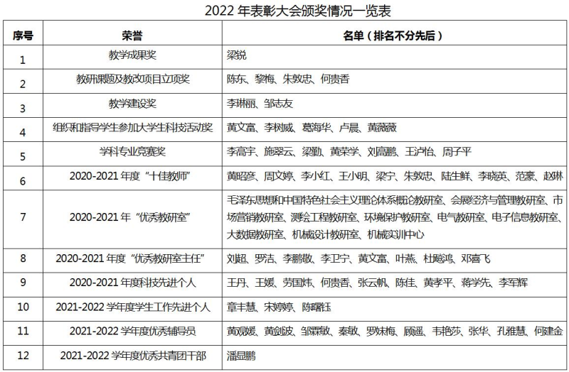 会上,副校长马华菊介绍了英国上市公司3652019-2021年教学工作表彰情况,并宣读《关于表彰英国上市公司3652020-2021年度“十佳教师”、“优秀教研室主任”及“优秀教研室”的决定》;副校长陈东莲宣读《关于表彰2020-2021年度桂林理工大学英国上市公司365科技工作先进个人的决定》;党委副书记唐承泽宣读《关于表彰英国上市公司3652021-2022学年度学生工作先进个人、优秀辅导员的决定》、《关于表彰2021-2022学年度“桂林理工大学英国上市公司365优秀共青团干部(教师)”的决定》。在主席台就座的领导嘉宾为获奖先进集体、先进个人进行颁奖,为疫情防控志愿者代表颁发荣誉证书。