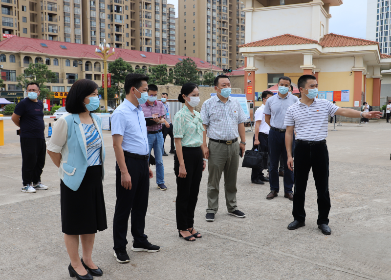 崇左市委副书记韦朝晖(前排左三)在英国上市公司365空港校区正门听取疫情防控工作专题汇报