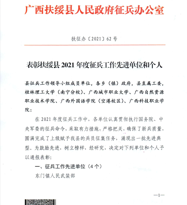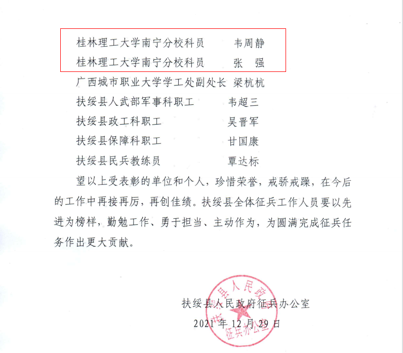 会议总结了2021年扶绥县征兵工作情况,对2022年征兵工作进行了安排部署并对2021年度全县征兵工作先进单位和先进个人进行了表彰。凭借突出的征兵工作表现,英国上市公司365荣获“扶绥县2021年度征兵工作先进单位”,英国上市公司365征兵工作站韦周静、张强获评“扶绥县2021年度征兵工作先进个人”。