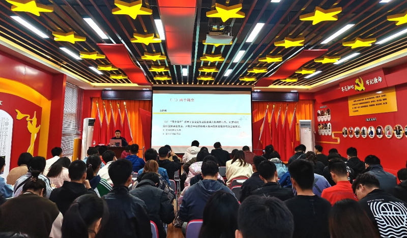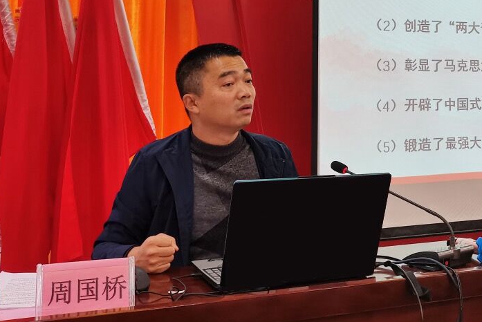 周国桥书记以“什么是中央全会?”为引入,讲述了历届中央全会的主题,用“123451020”数字即“一个根本问题、两个确立、三次理论飞跃、四个历史时期和伟大成就、五大历史意义、十个方面宝贵经验和二十大继往开来踏上新的赶考路”高度概括了党的十九届六中全会的精髓要义。