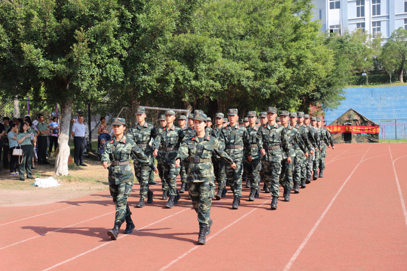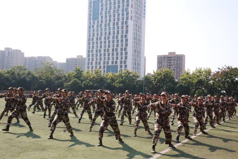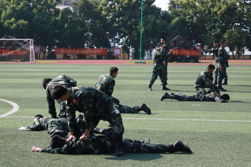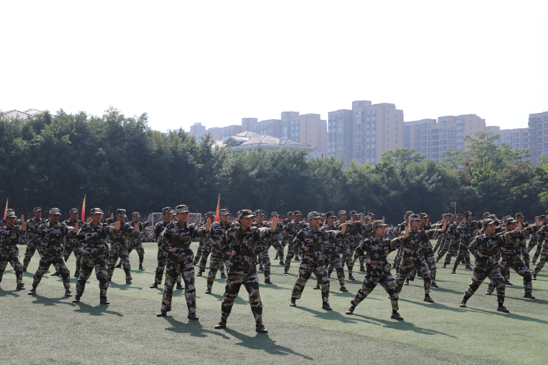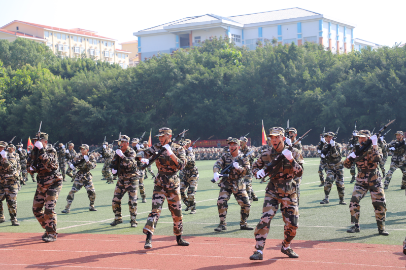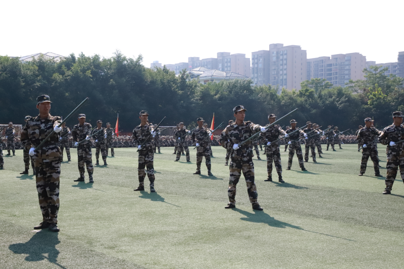 伴随着分列式进行曲,经过十余天紧张训练的参训新生排成方阵,身着戎装、精神饱满,以标准的军姿、高昂的士气、铿锵的步伐,意气风发地依次走过主席台。随后,刺杀操、擒敌拳、应急棍、匕首操方队和教官们带来了气势磅礴的军事项目表演。