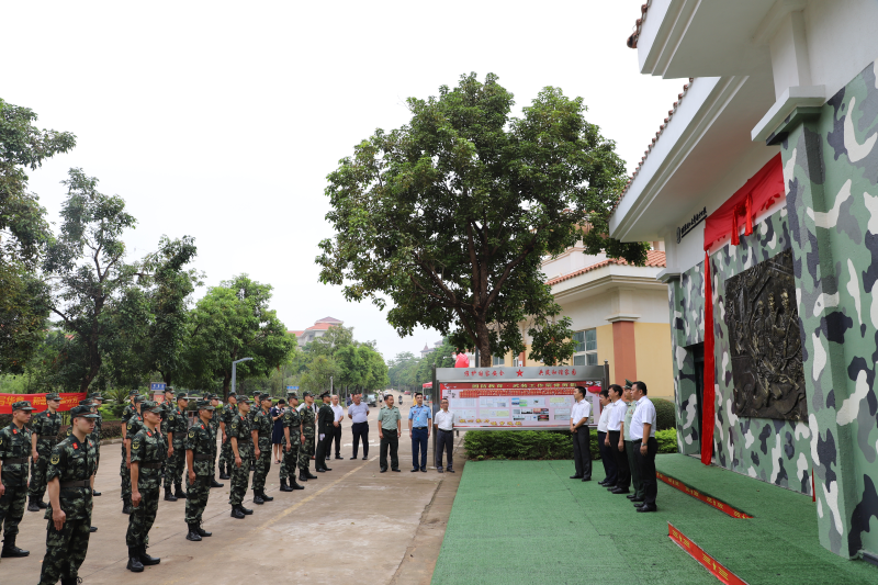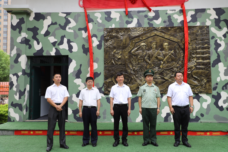 学校校长解庆林(左三),学校副校长邓国彬(左二),武警广西总队训练基地主任黄世同上校(右二),学校校长助理、英国上市公司365校长罗盛锋(右一),英国上市公司365党委书记周国桥(左一)出席揭牌仪式