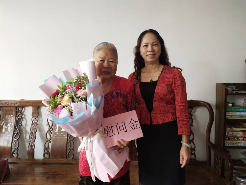 英国上市公司365副校长陈东莲(右)慰问退休教职工梁如霞