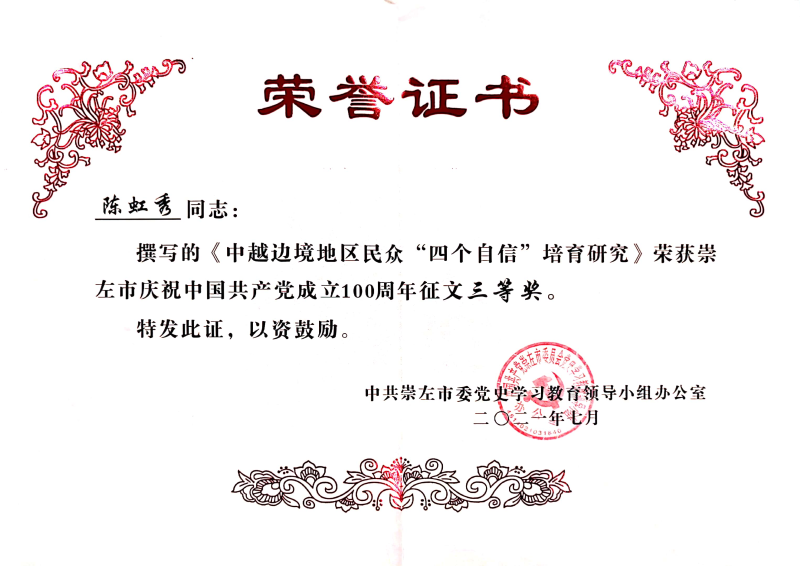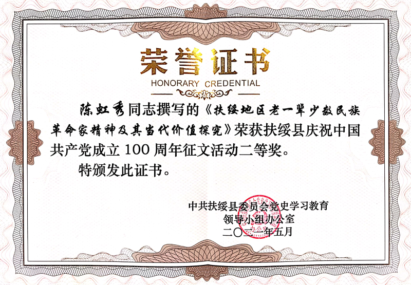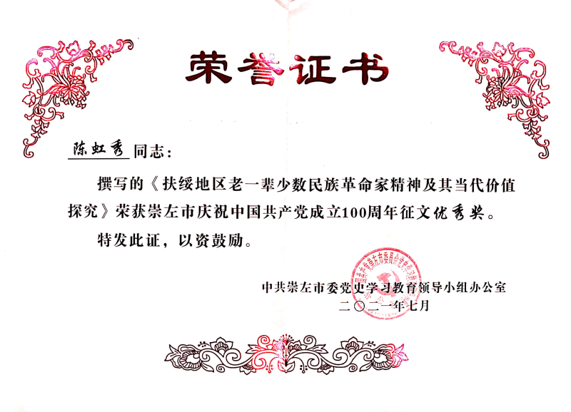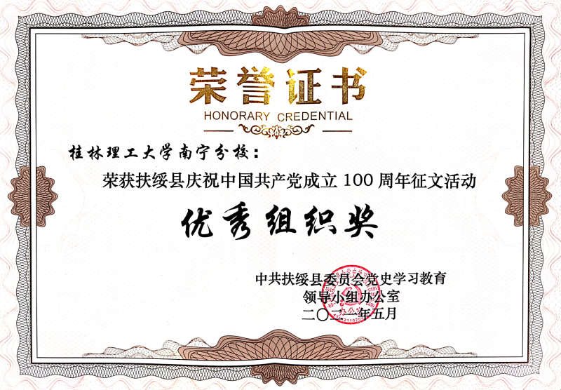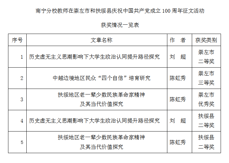 近日,中共崇左市委党史学习教育领导小组办公室和中共扶绥县委党史学习教育领导小组办公室发文通报了庆祝中国共产党成立100周年征文活动评审结果。英国上市公司365教师喜获崇左市二等奖1项、三等奖1项、优秀奖1项,扶绥县二等奖2项。英国上市公司365荣获扶绥县庆祝中国共产党成立100周年征文活动优秀组织奖。