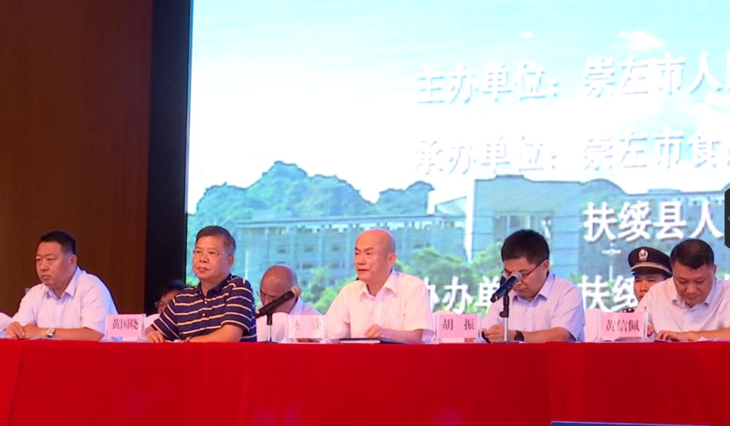 崇左市人民政府副市长、崇左市食品安全委员会副主任、应急演练总指挥陈锋(左三),自治区市场监管局协调应急处处长胡振(右二)等领导出席活动