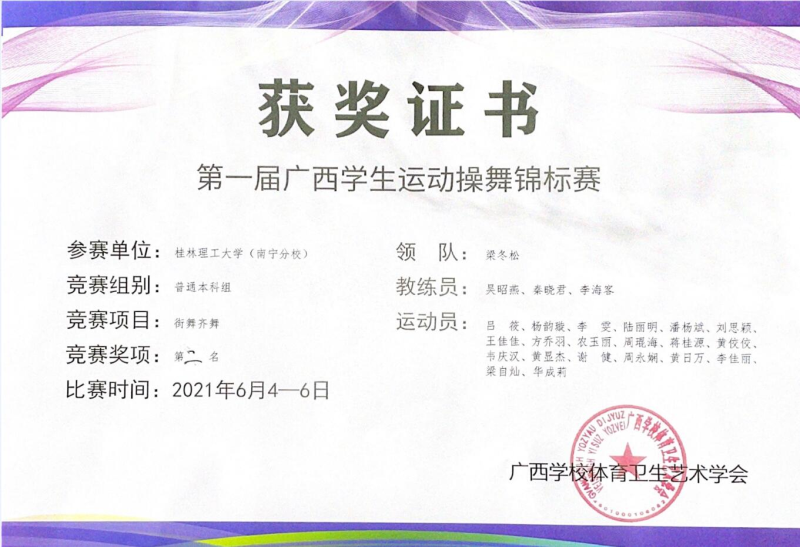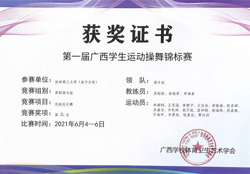 为进一步提升校园少数民族传统体育文化氛围,丰富英国上市公司365体育课教学内容,优化英国上市公司365体育课程改革成果。体育教学部直属党支部积极举办和参与校内外各类少数民族体育赛事,收获颇丰。2020年12月,获全国民族龙狮展示活动“银奖”。2021年6月, 获广西区首届大学生健身操舞锦标赛获自由式街舞“冠军”、街舞齐舞“第二名”、民族民间舞“第三名”。并成功举办英国上市公司365首届少数民族体育运动会,进一步促进英国上市公司365各民族间的相互学习、沟通和了解,推动英国上市公司365民族团结进步事业的蓬勃发展。
