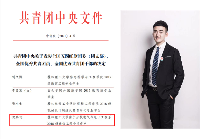 贺鹏飞同学荣获2020年度“全国优秀共青团员”荣誉称号