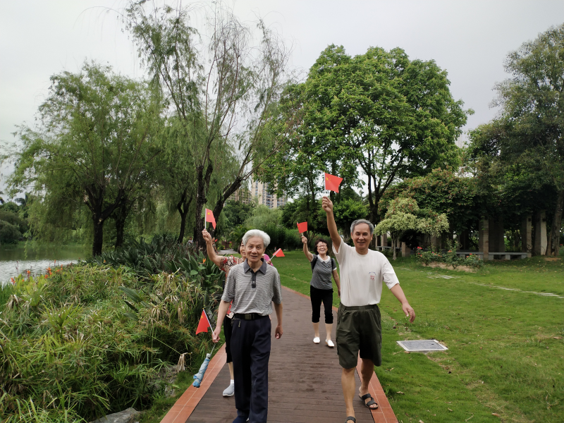 花香飘苍穹,芬芳缘大地。花卉公园鲜花盛开,花香沁人心田。老同志们昂首阔步,手举小国旗迎风飘展,他们精神抖擞,步履轻盈,一边欣赏美丽的湖光水色,一边同身边的老同事们感叹着建党百年来国家繁荣富强的伟大发展历程,并告诉我们这一代青年,要珍惜今天来之不易的生活,学习党的光荣历史,不忘初心牢记使命。