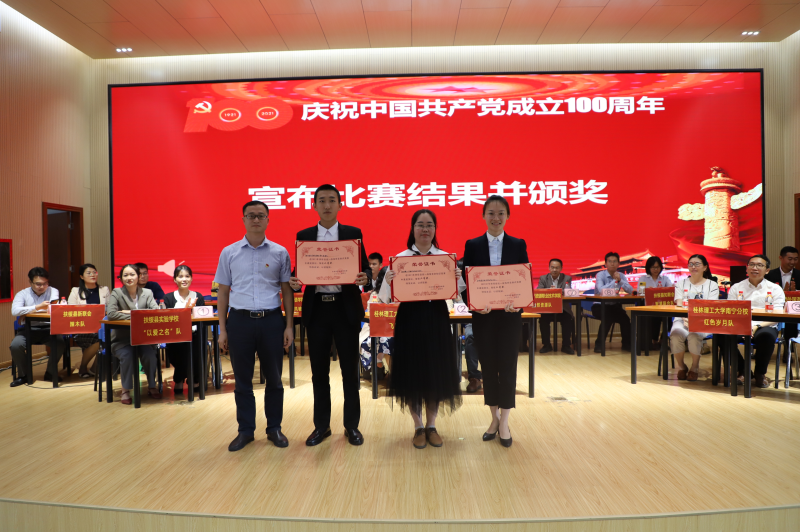 崇左市委统战部副部长赵恒镇(左一),桂林理工大学英国上市公司365党委委员、副校长苏欣(右一)为获奖队伍颁奖