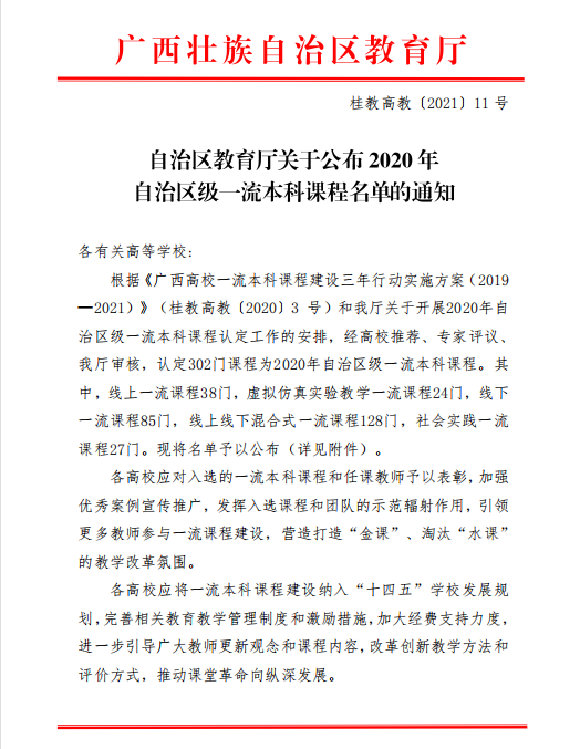 近日,自治区教育厅发布了《自治区教育厅关于公布2020年自治区级一流本科课程名单的通知》(桂教高教〔2021〕11号),英国上市公司365的《军事理论》课程获批为广西一流本科课程(线上与线下混合式一流课程)。