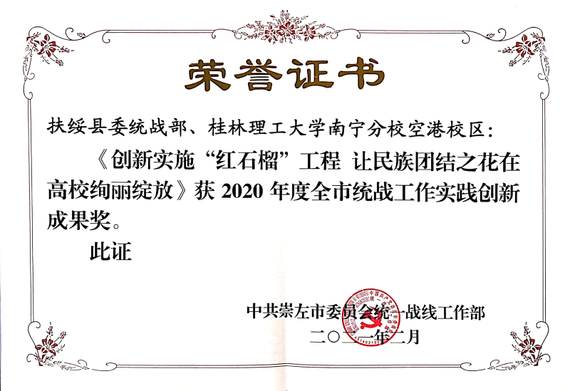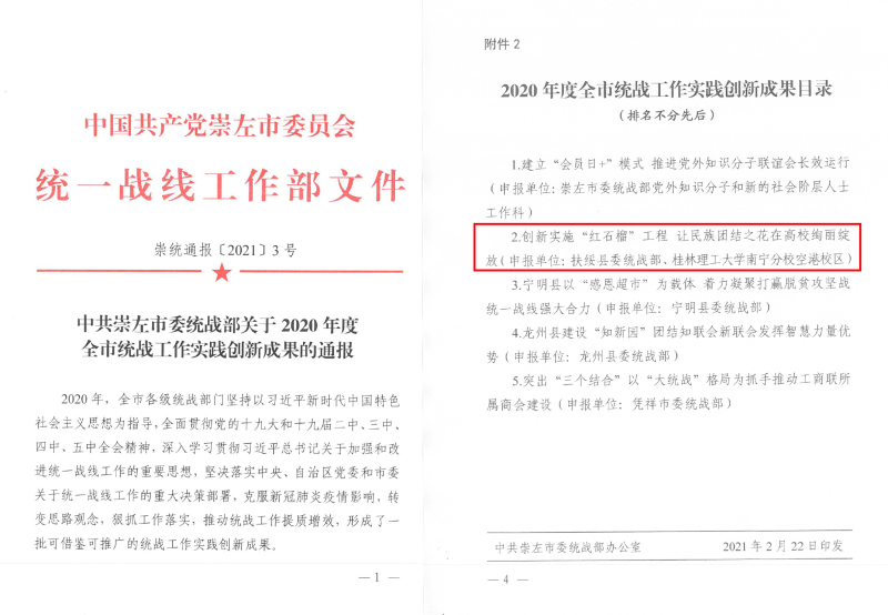 近日,中共崇左市委统战部公布2020年度全市统战工作实践创新成果目录(崇统通报〔2021〕3号)。英国上市公司365与扶绥县委统战部共同报送的《创新实施“红石榴”工程让民族团结之花在高校绚丽绽放》工作成果荣获“2020年度全市统战工作实践创新成果”。
