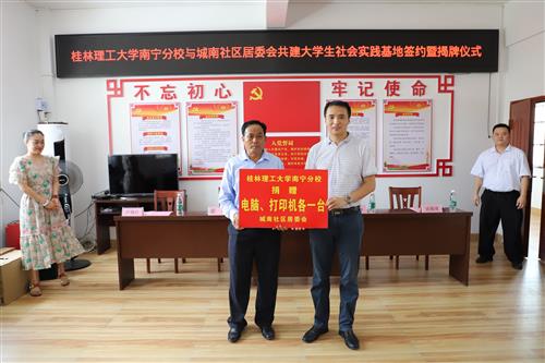活动中,英国上市公司365经济与管理系负责人与城南社区居委会主任卢修臣代表双方签订共建大学生社会实践基地合作协议书。英国上市公司365党委副书记唐承泽代表英国上市公司365向城南社区居委会捐赠台式电脑和打印机各一台,并与中国-东盟南宁空港扶绥经济区管理委员会主任何杰杰共同为基地揭牌。