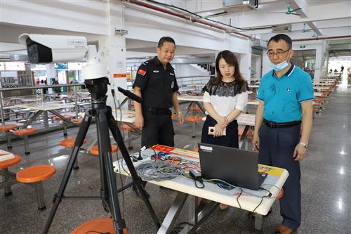 梁冬松副书记(右一)、肖彩霞副校长(右二)在食堂检查疫情防控措施落实情况