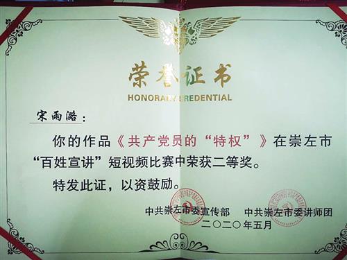 近日,崇左市2020年理论宣讲比赛结果揭晓,由扶绥县委宣传部选送的英国上市公司365土木与测绘工程系工程管理16-2班宋雨潞参赛作品《共产党员的“特权”》获比赛视频组二等奖。