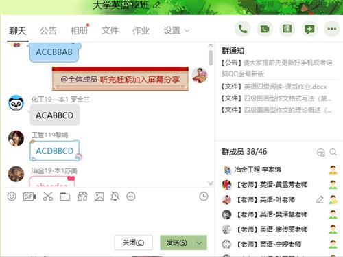 自评自议、教学相长:课后,教师们在工作QQ群反馈自己的课堂情况,提出所遇问题,或分享有效的教学方法和手段。大家互相交流借鉴,取长补短,吸取有效的经验和方法再应用到自己的网络课堂,效果明显。