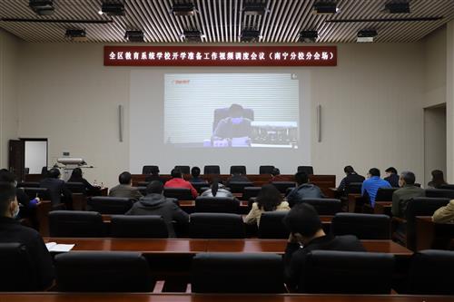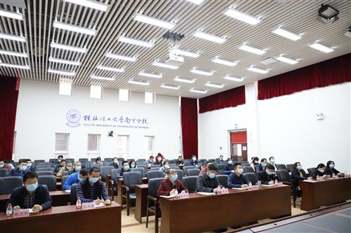 南宁分校在空港校区图书馆报告厅设分会场,校领导冯兵、周国桥、梁冬松、何斌、唐承泽、陈东莲、耿杰利、苏欣、肖彩霞、马华菊出席会议,各单位各部门负责人参加会议。
