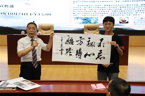 在讲座期间,籍更森先生还将自己的墨宝作为弘扬国学传统文化的纽带,赠予了现场两位老师和两名同学。