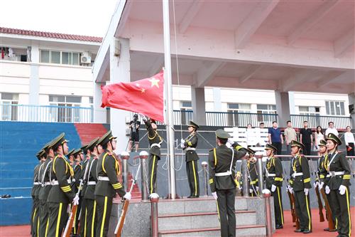 上午7时,英姿飒爽的国旗班成员迈着整齐划一、铿锵有力的步伐,昂首挺胸正步前进,护送国旗入场,伴随着庄严的国歌声,五星红旗冉冉升起,全体师生齐唱国歌并向迎风飘扬的国旗行注目礼,共同祝福伟大的祖国繁荣富强。
