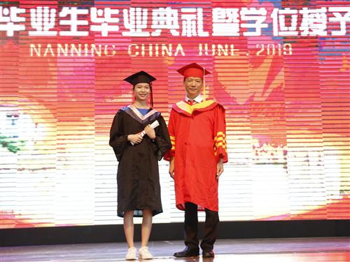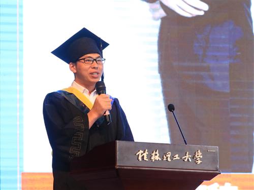 土木与测绘工程系工程管理15-1班兰海貌同学代表毕业生发言,诚挚地表达了对母校和老师们的感恩之情,并表示将始终秉承“厚德笃学,惟实励新”的校训,勇敢迎接人生新的挑战,不辜负母校和师长的期望,为中华民族伟大复兴贡献“桂工人”的智慧和力量。
