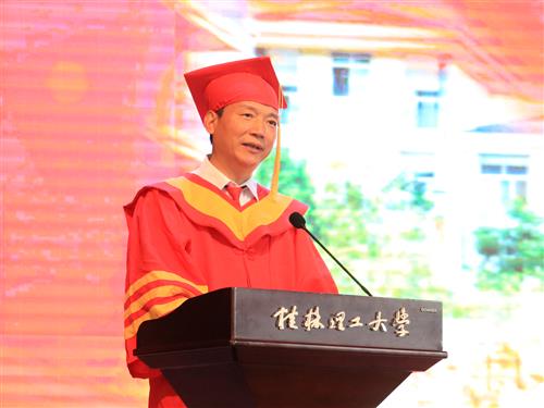 三是希望同学们始终脚踏实地,不懈奋斗建功伟大时代。“千里之行,始于足下”。希望大家不管将来从事什么职业,都要发扬“艰苦创业、敬业奉献、团结协作、开拓创新”的桂工精神,谦虚谨慎、踏实做事。要学会坚持。生活就像马拉松,需要坚持,需要坚韧。要认真对待每一项任务,认真做好每一件小事。要努力克服每一个困难,把每一次挫折当作是人生历练,少一些不满和叹惜,多一份忍耐和坚守。要学会感恩。我们感恩学校的培养,师长的教诲,感恩这个伟大的时代给予我们的一切。我们唯有加倍努力,不懈奋斗,挥洒青春汗水,建功伟大时代,回报伟大时代。