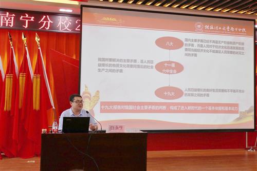 4月29日下午,分校党委书记、党校校长白永生以党的十九大精神为主题,在党校党员活动中心为分校2019年第1期党员发展对象培训班全体学员上专题党课。培训班92名党员发展对象参加党课学习。