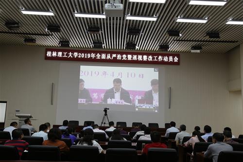 4月10日下午,学校在雁山校区图书馆报告厅召开2019年全面从严治党暨巡视整改工作动员大会。学校领导李国忠、解庆林、王赣华、孙宁、陈学军、王玫、周国清、梁福沛、王敦球、曾繁荣、张劲松出席会议。全体中层干部,附小、社区办、校办企业主要负责人,党办、组织部、宣传部、统战部、纪委办、人事处等部门科级干部参加会议,分校领导班子及全体部门正职通过视频会议系统参加会议。会议由学校党委副书记、校长解庆林主持。