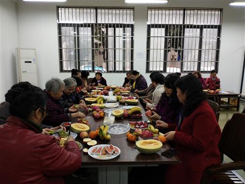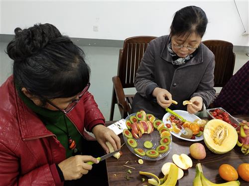 裁判宣布开始口令,现场气氛立刻热烈起来。面对黄澄澄的橘子、红艳艳的圣女果、胖墩墩的哈密瓜等各种美味的水果,退休女教师们忙得不亦乐乎,有的削皮,有的切块,有的雕花,大家都胸有成竹有备而来。比赛中,选手们充分发挥自己的想象和激情,拿出了各自的“看家”本领。一小时后,一盘盘造型精美、五彩缤纷、果香四溢的水果拼盘展现在了大家面前。