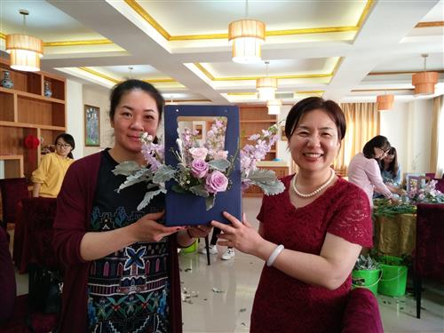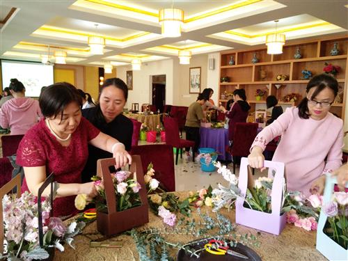 参会女教职工积极参与、热情互动,在教师指导下精心构思,认真修剪,一束束鲜花、一枝枝绿叶,在女职工的巧手下变得诗情画意,制作出了一件件清新雅致、高雅秀丽、别具风情的插花艺术作品。