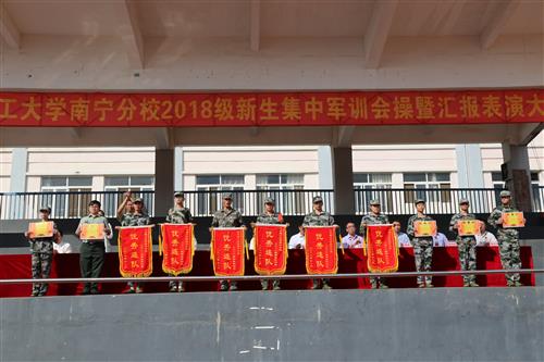 分校党委白永生书记宣布嘉奖令。他指出,2018级新生集中军事训练工作在分校党委、行政和分校军训领导小组的领导下,由分校保卫工作部精心组织,崇左陆战教育发展有限公司精选了73名教官,分校各系和学工部选派了20名指导员和多名辅导员及班主任与3649名2018级新生们一起,经过12天的摸爬滚打、流血流汗,取得了圆满成功,并涌现出了一批先进集体和先进个人。经过军训团的评选,共评选出1连等6个连队为“军训先进集体”、向海泉 等30名同志为“优秀教官”、黄华等20名同志为“优秀指导员”、汤永香等425名同学为“学生军训优秀学员”。白书记希望,受到表彰的先进集体和个人珍惜荣誉,发扬成绩,再接再厉,在今后的学习和工作中取得更好的成绩。同时,军训团号召广大同学以受表彰的先进集体和个人为榜样,学习他们不怕苦不怕累,团结奋进的精神,为学校实现跨越式发展而努力奋斗。主席台就坐领导嘉宾为获奖集体、教官、指导员、学员颁奖。