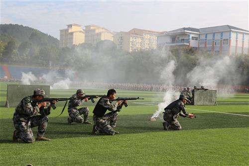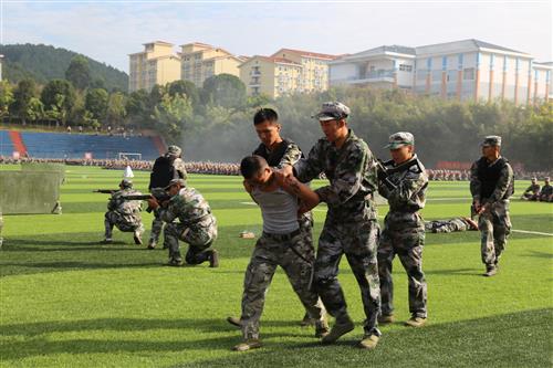 单兵战术综合演练。跃矮墙、过索道、穿火圈、涉雷区,负重前行,擒敌格斗一招制敌,精准射击……演练经过精心筹划,严密组织,贴近实战,提高了参训学子战术综合应用技能和战斗运动能力、战斗技术能力、战斗行动能力等,培养了学子们英勇顽强、机智灵活的战斗作风。