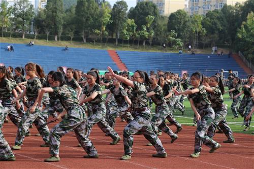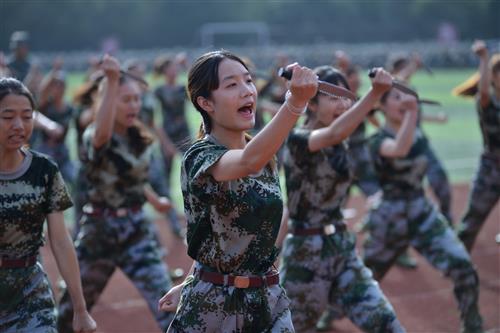 女子匕首表演。军训不只是走正步、喊口号,咱们桂林理工大学英国上市公司365空港校区的姑娘们“操刀子”!姑娘们手握15厘米长橡胶制“匕首”,右脚原地用力下踏,左脚向右跨弓步后迅速转身,左臂向上划掌格挡在胸前,动作整齐划一,关键时刻一声吼,气势如虹。她们在用行动诠释了巾帼不让须眉!