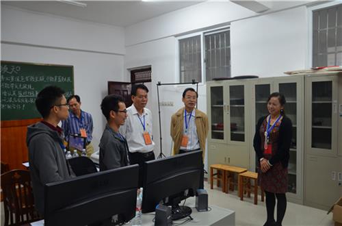 分校副校长陈东莲(右一)在监控室检查考场情况
