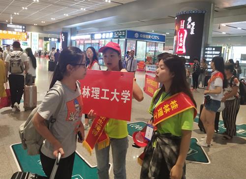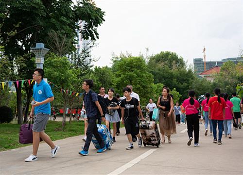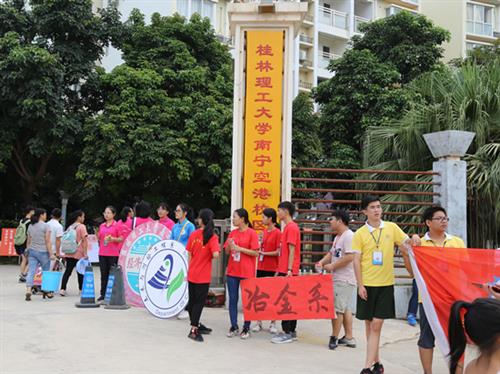 校园内,到处是红色的欢迎条幅、路旗、拱门和人性化的道路指示。在迎新现场,衣着鲜明的志愿者们不停地穿梭在校园中,迎接来自五湖四海的新生,给新生指路、为新生拎包、拖运行李箱,并热情地介绍风景美如画、服务暖人心的桂工大家庭。