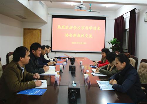 12月14日上午,崇左市科协主席田芳颖、科技咨询中心副主任黄仁凤和扶绥县科协主席陈静一行3人到分校交流座谈。分校校长冯兵,副校长陈东莲,校长助理刘高鹏和科技管理部负责人等热情接待了来访客人。