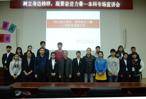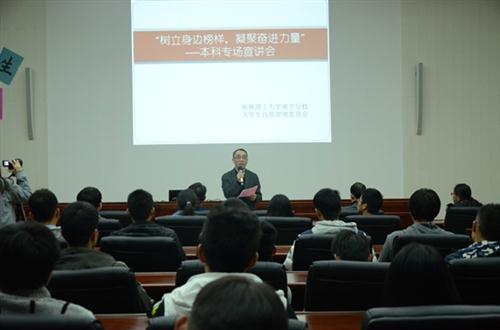 为加强学风建设,弘扬桂工精神,传递青春正能量,11月21日下午,分校在图书馆报告厅召开主题为“树立身边榜样,凝聚奋进力量”的本科专场宣讲会。分校党委副书记梁冬松出席会议并讲话。分校学生工作部主要负责人和团委相关人员,以及分校2017级全体本科学生到场聆听了宣讲会。