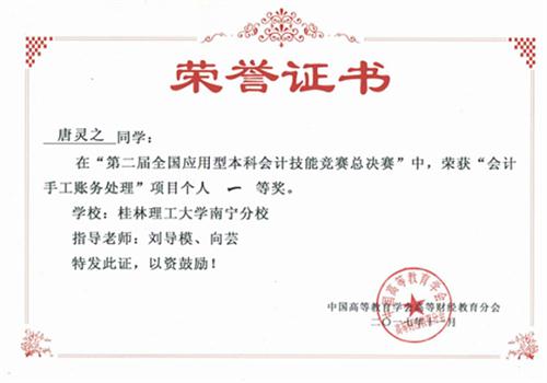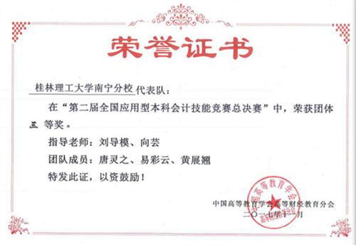 第二届全国应用型本科会计技能竞赛总决赛由中国高等教育学会高等财经教育分会举办,江苏理工学院、用友畅捷通有限公司和厦门网中网有限公司共同承办,是目前中国高等教育学会财经教育领域最专业的赛事活动之一。此次全国总决赛,全国共有24个省、自治区、直辖市高校共51支队伍153人参加,其中广西有3所高校3支代表队参加比赛。由英国上市公司365代表的桂林理工大学是总决赛中广西队伍获得最好成绩的高校。分校学子在指导老师的专业指导下,经过的辛苦备赛,在赛场上发挥了专业水平,充分展现出分校教育教学改革的丰厚成果,为学校赢得了荣誉。