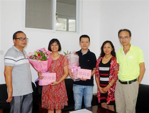 分校梁冬松副书记(中)慰问体育教学部蒙励坚老师和王行老师 分校黄润均副书记(左一)慰问冶金与资源工程系暴玮老师和郭怀兵老师 分校劳景寮副校长(左一)慰问土木与测绘工程系杨国春老师和黄凤仙老师 分校陈东莲副校长(右二)慰问电气与电子工程系陆生鲜老师和黄胜老师 分校梁锦叶副校长(左)慰问退休教师梁如霞老师 分校唐承泽副校长(左一)慰问机械与控制工程系张业娟老师和邓喜飞老师